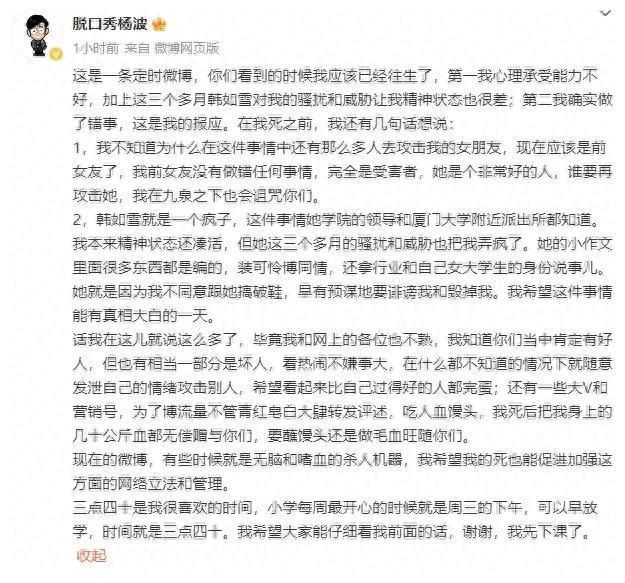 以上是脱口秀演员杨波在一又友圈讲演我方轻生一事。