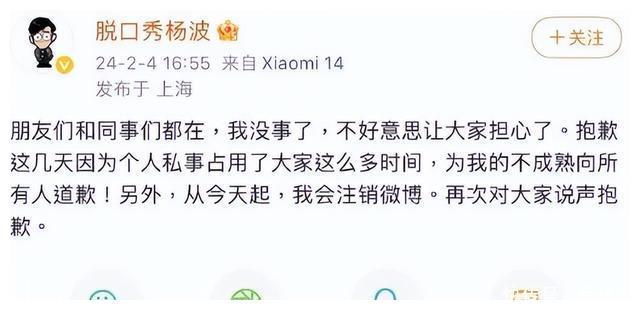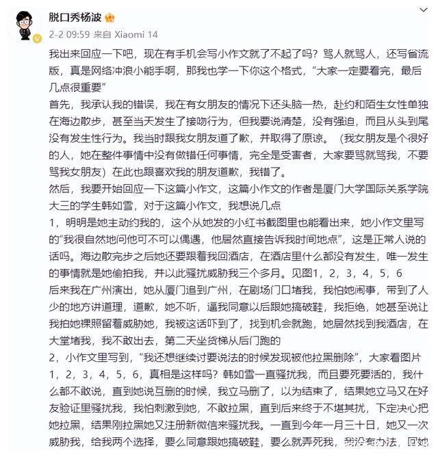 我心中一动,杨波不即是今天早上刚发文承认出轨的阿谁脱口秀演员嘛。他的应答平台发文是这样的。